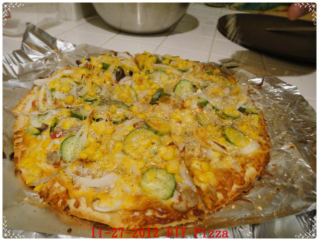 餅皮買現成的,之後我們再加上玉米粒,小黃瓜,洋蔥和起司。Tim有加了一項秘密武器:"白芝麻",所以吃起來味道更香喔!