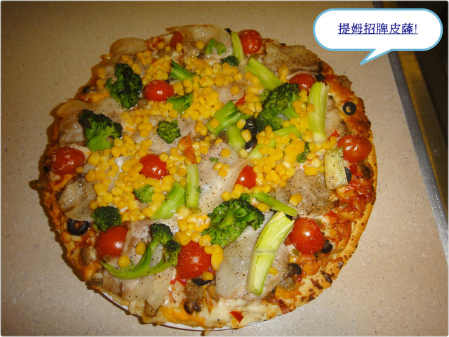 Tim為我特製的:蔬菜很多的皮薩,非常好吃喔!